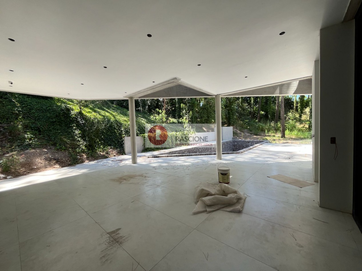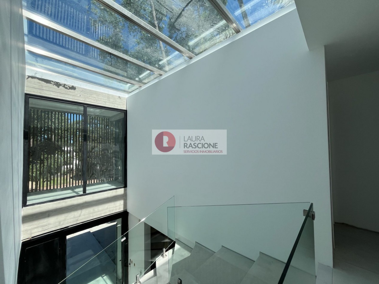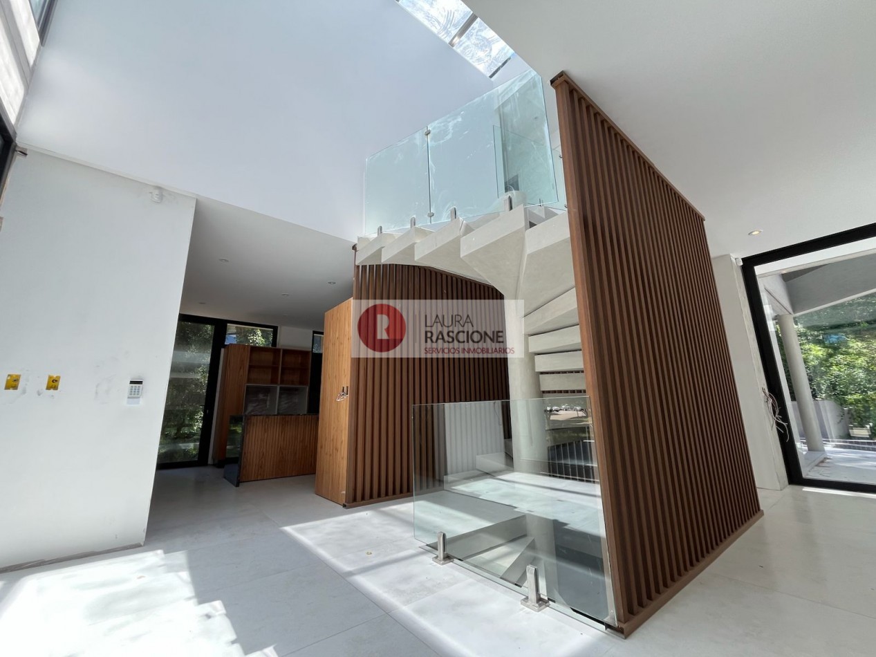 La casa se desarrolla en 3 niveles (Subsuelo, Planta baja y Planta Alta) los cuales se conectan mediante una escalera tipo espiral y ascensor. Se disponen así en el nivel inferior espacios de servicio como son el amplio lavadero y un dormitorio de huéspedes en suite con vestidor incluido; también cuenta con una gran cochera pensada para aparcar 3 vehículos y múltiples espacios de ocio con sauna, hidromasajes, playroom y gimnasio.