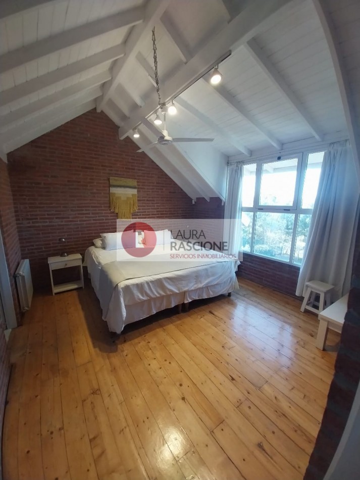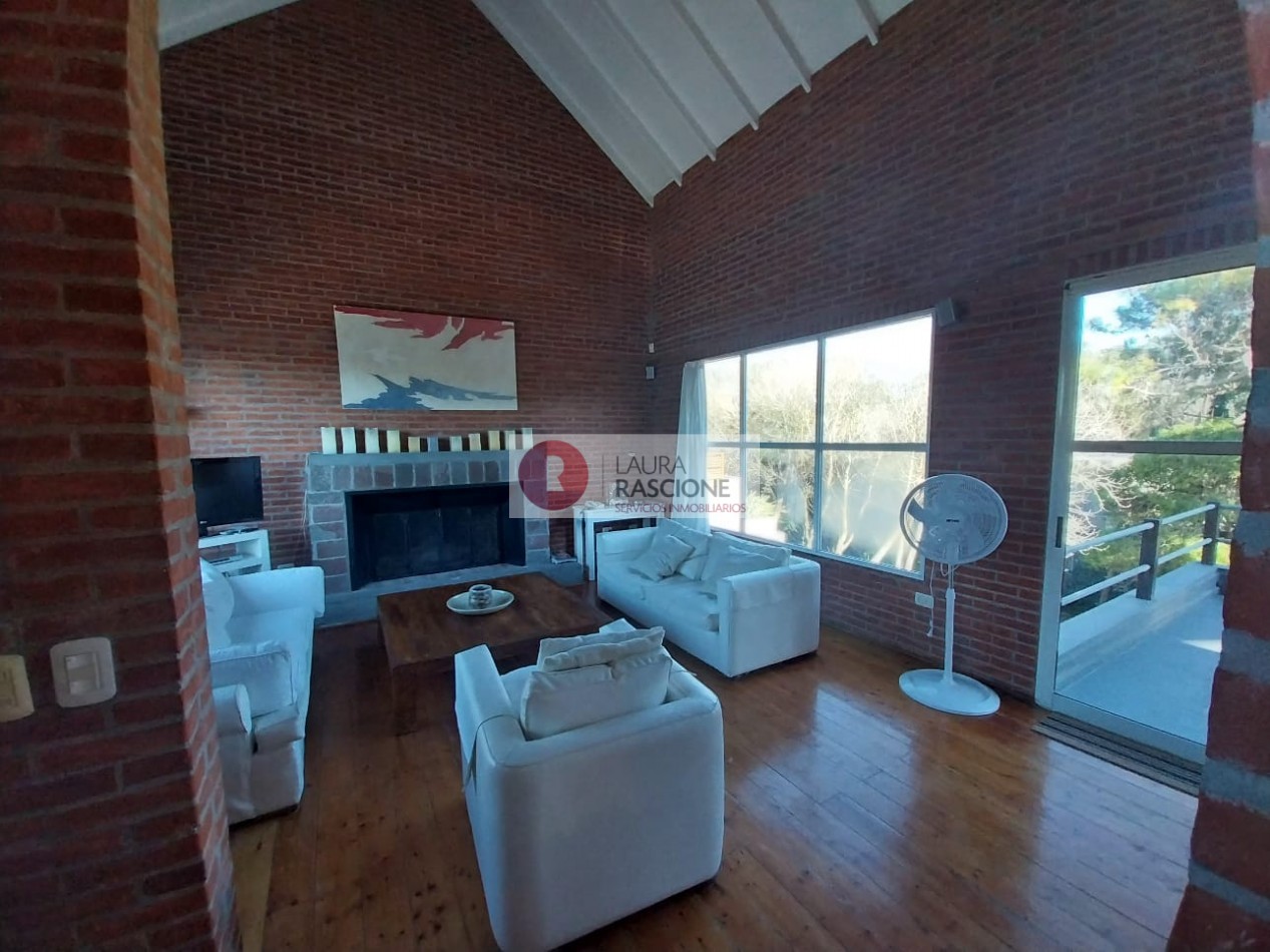Al ingresar nos encontramos con un amplio living con ventanales con vistas divinas al frente de la propiedad y al parque trasero de 1100m2, también se destacan sus techos de doble altura, su hermoso hogar a leña, sus amplios sillones con mesa ratona de gran tamaño y calidad deco.