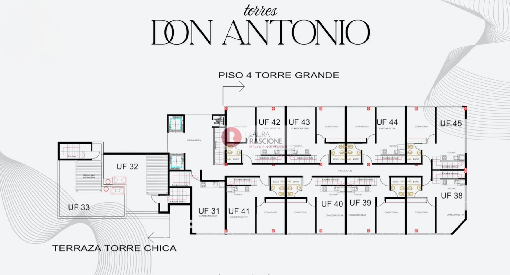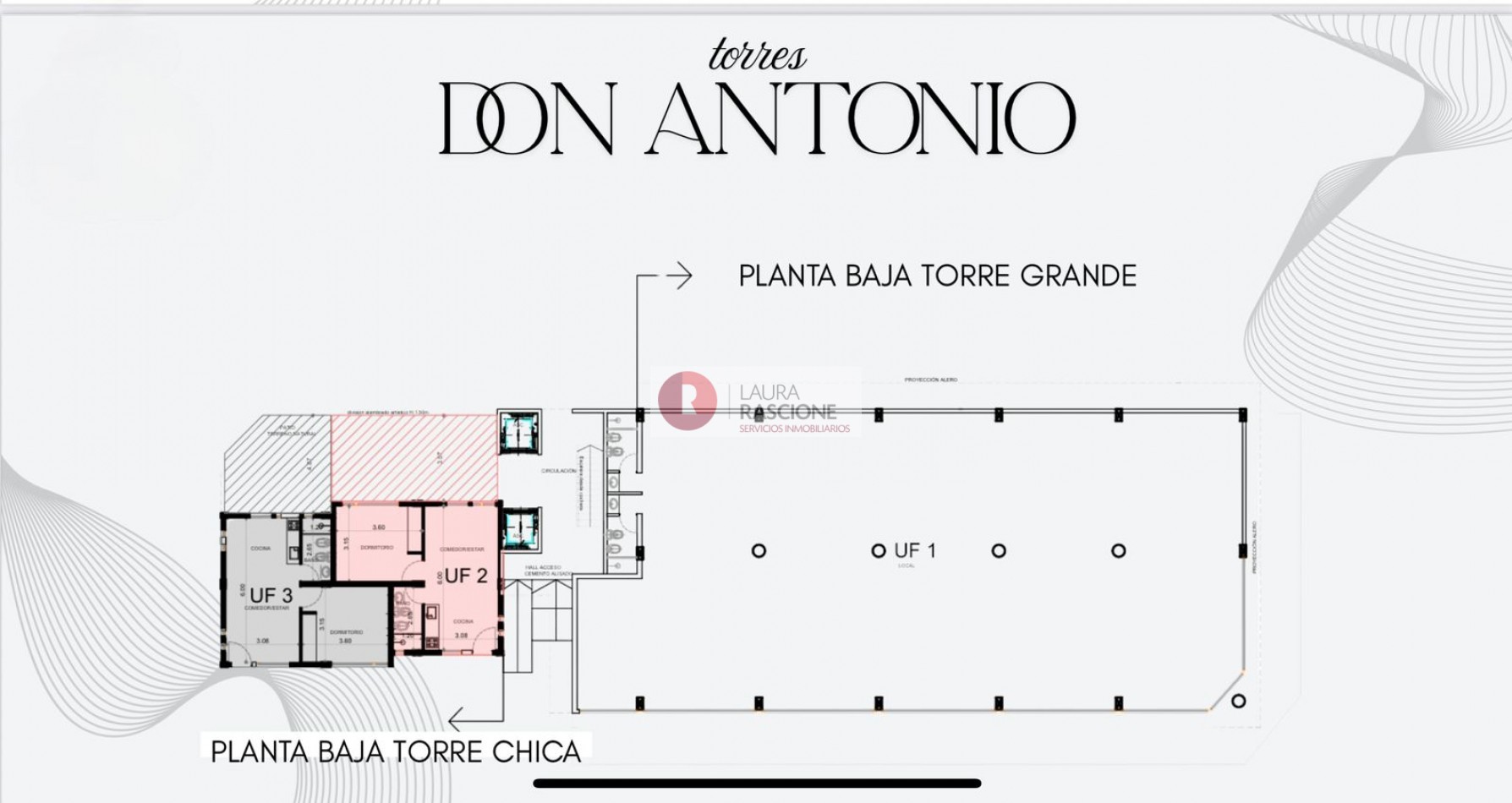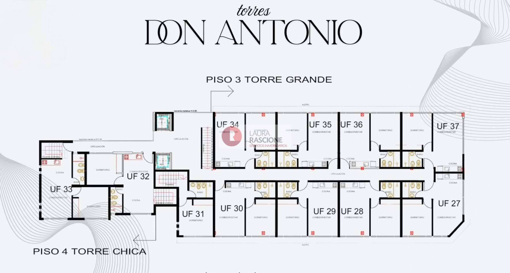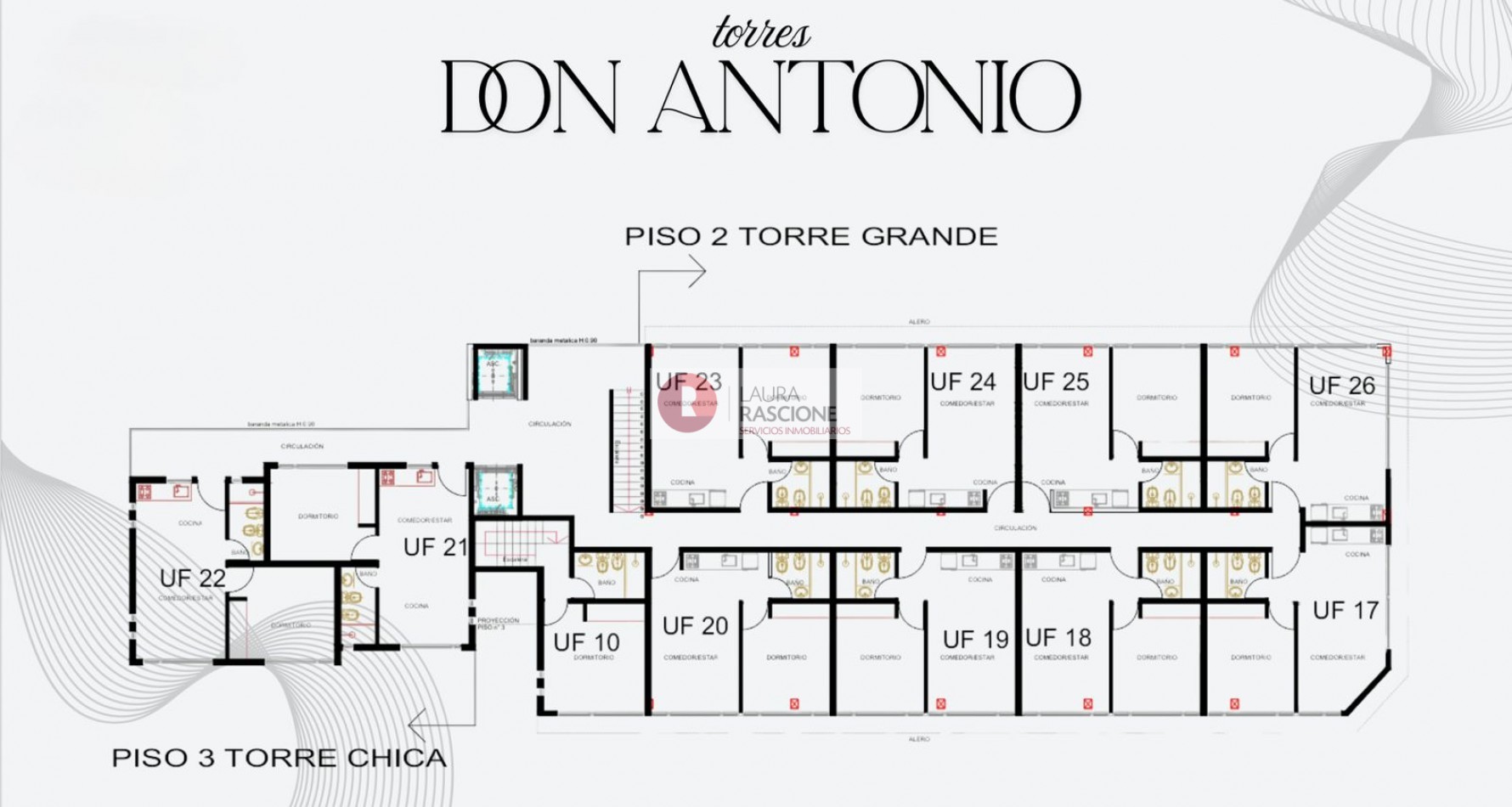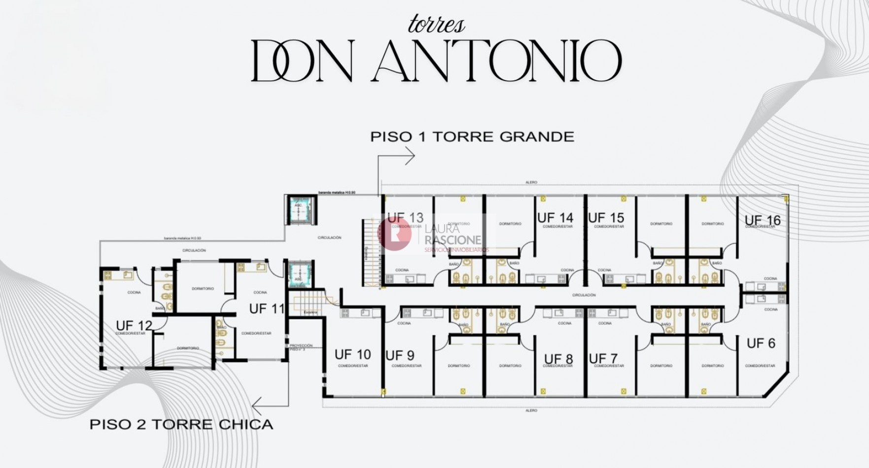 Las torres I y II, estarán conformadas por 44 departamentos de 2 ambientes, teniendo en cuenta que las unidades que se encuentran en el piso mas alto de las torres, tendrán incluidas sus propias e individualizadas terrazas.