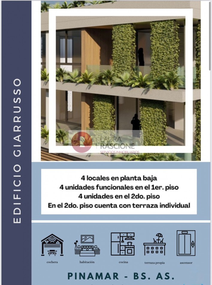 Dispone de 4 locales en planta baja, 4 unidades funcionales en el primer y segundo piso, este ultimo cuenta con terraza individual.